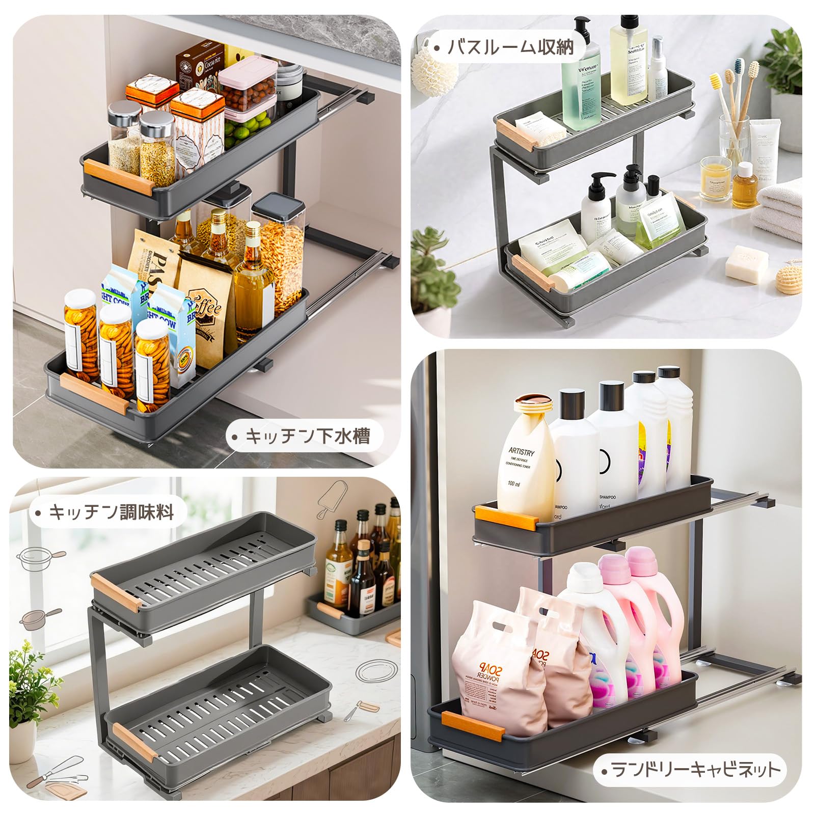 シンク下ラック 調味料収納ラック L型 2段 双方向スライド式 幅41×奥行22×高さ36cm 大容量 防錆処理済み鉄材 浴室 キッチン バスルーム ホワイト 洗面台下収納棚 小物整理 組立簡単 省スペース