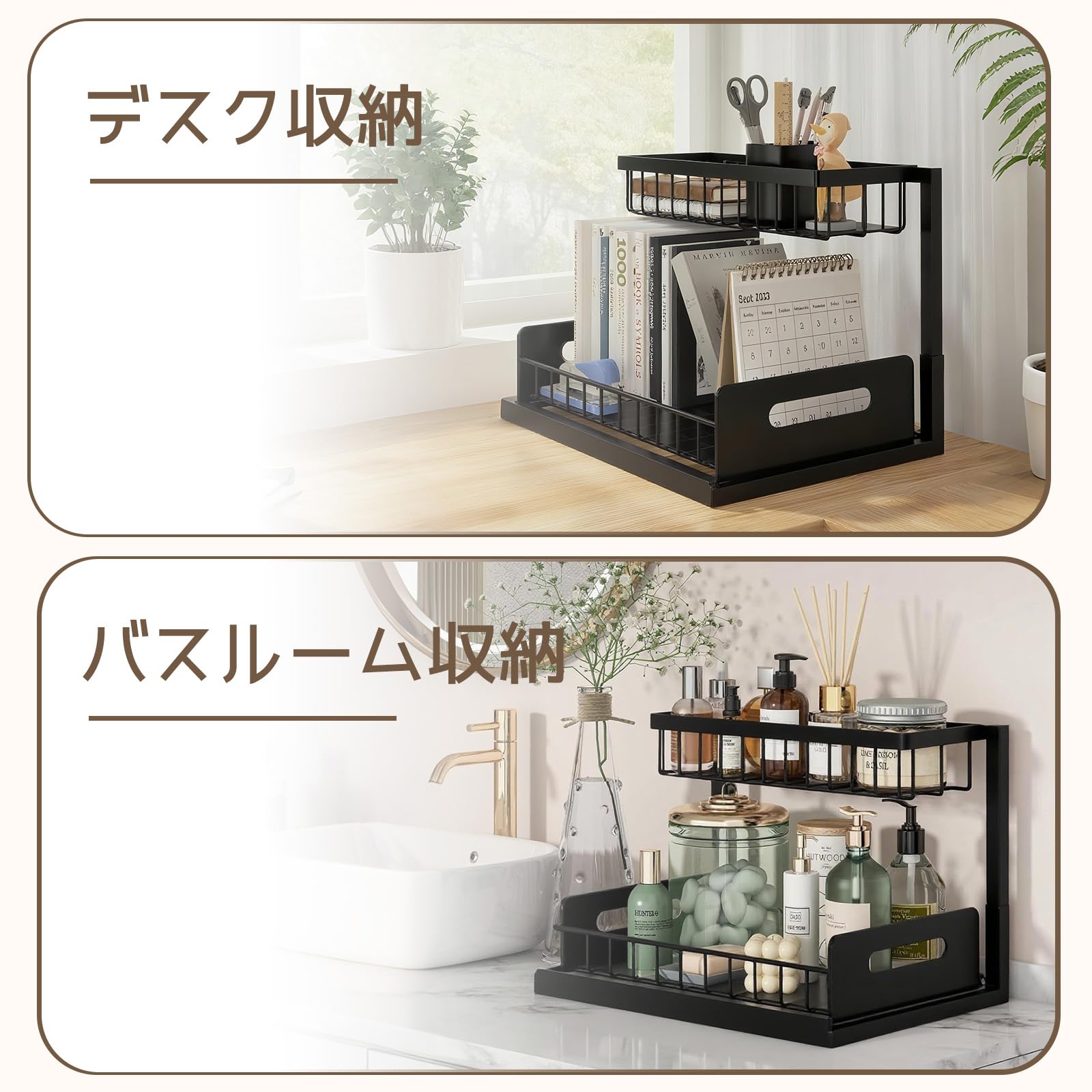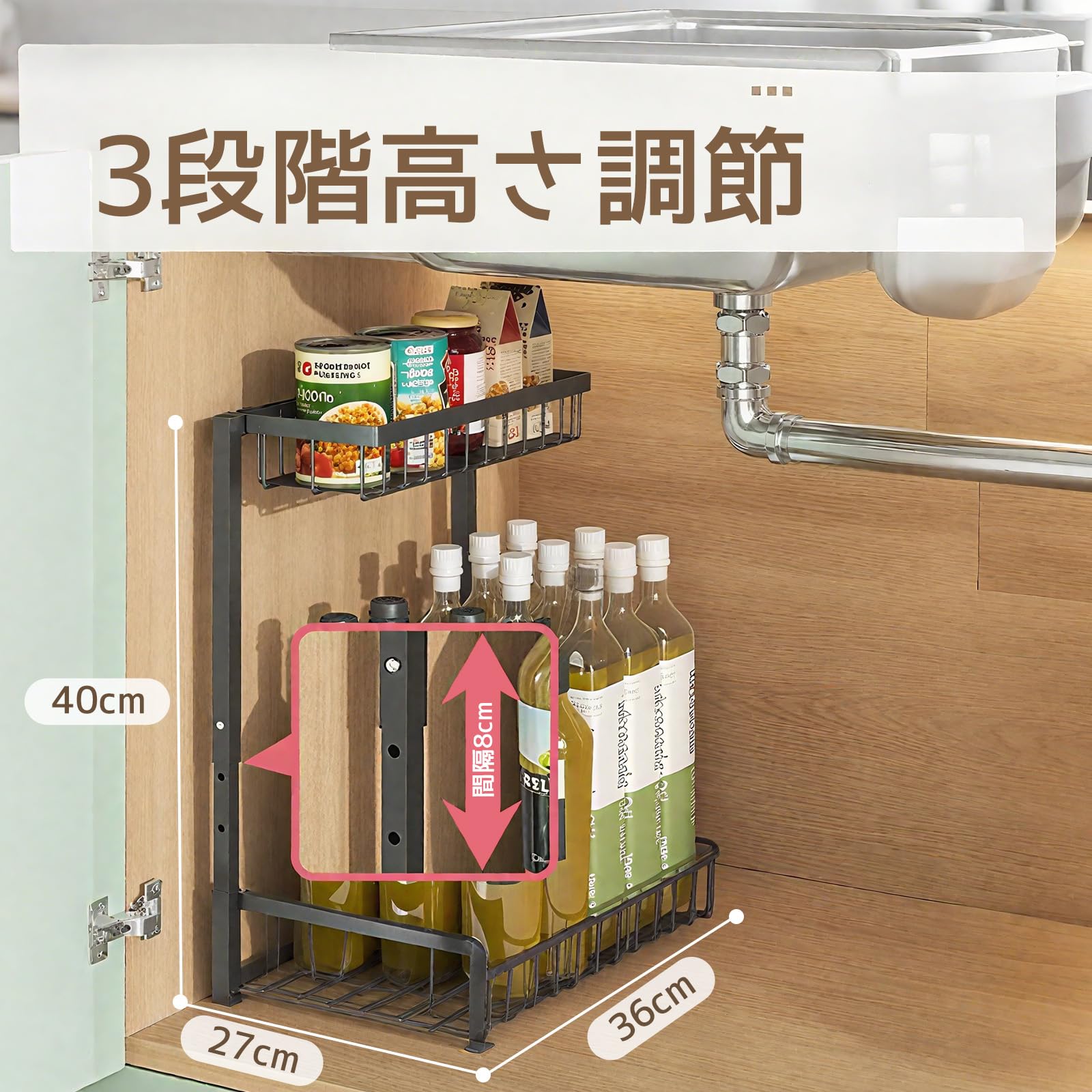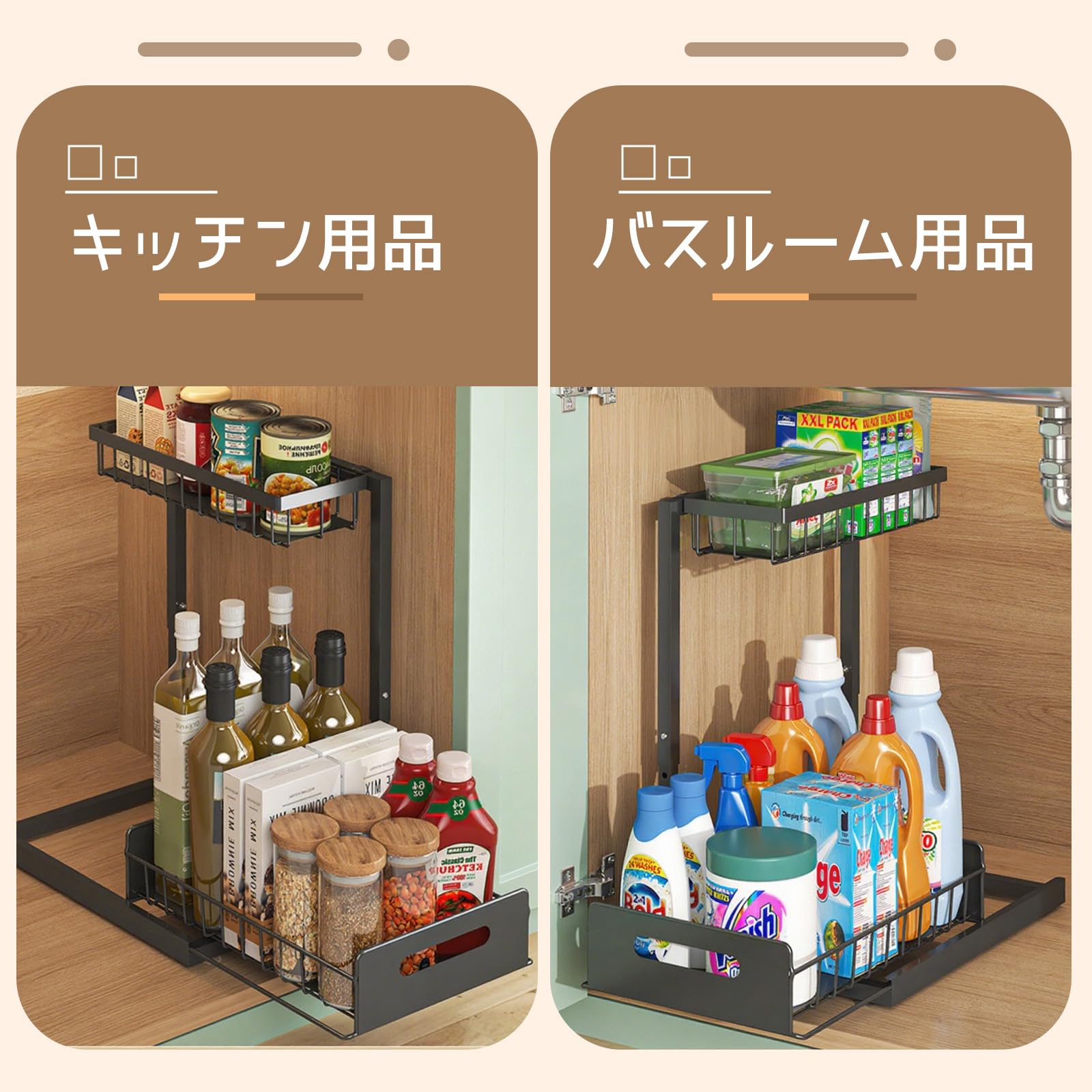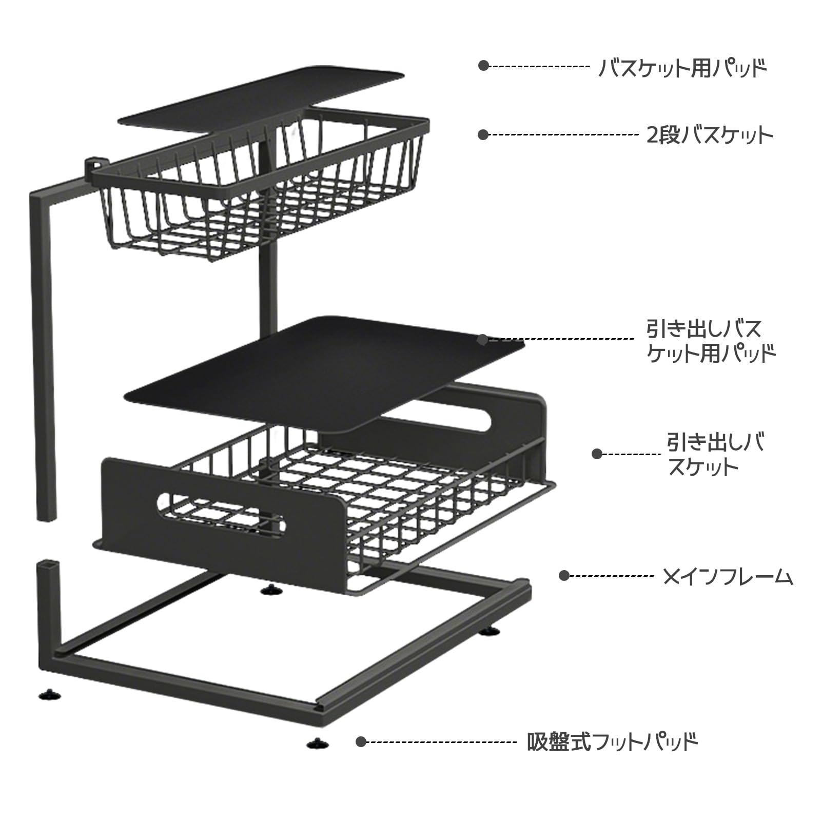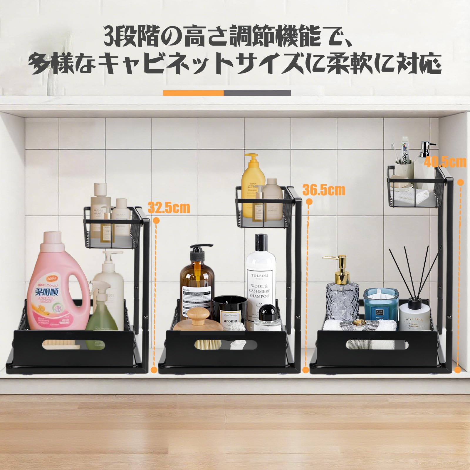 シンク下 収納 L型 2段引き出しカゴ 32.5~40.5cm3段階高さ調節 鉄製・防水防錆仕様 大容量 組立簡単 省スペース 調味料ラック キッチン バスルーム 洗面所 化粧台収納