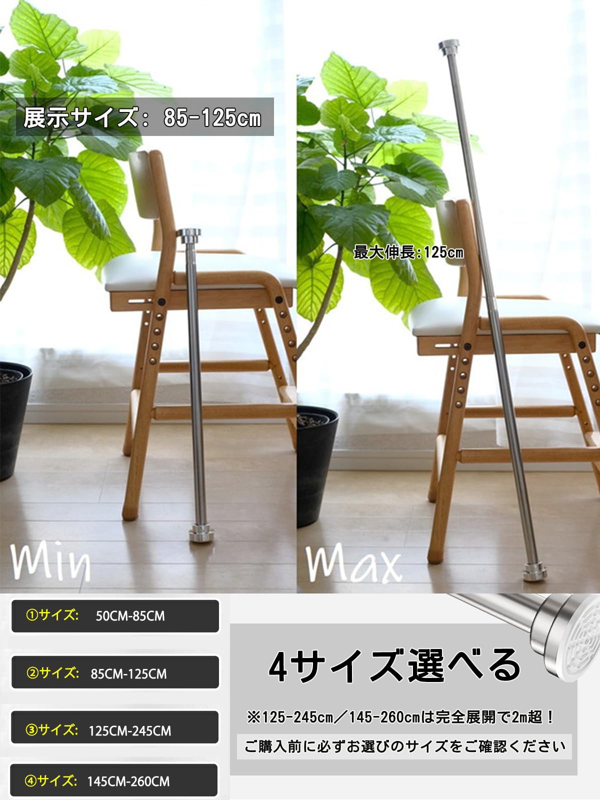 ステンレス製の伸縮棒、穴あけ不要、超強力伸縮棒:幅50-260cm、耐震・頑丈設計、耐荷重40-50kg、転倒防止サポート棒幅調節可能、複数長さ、天井に対応、浴室収納、窓枠、室内物干し棒、部屋、窓枠、シャワーカーテン、寝具干し、ワードローブ、コート伸縮棒、クローゼット