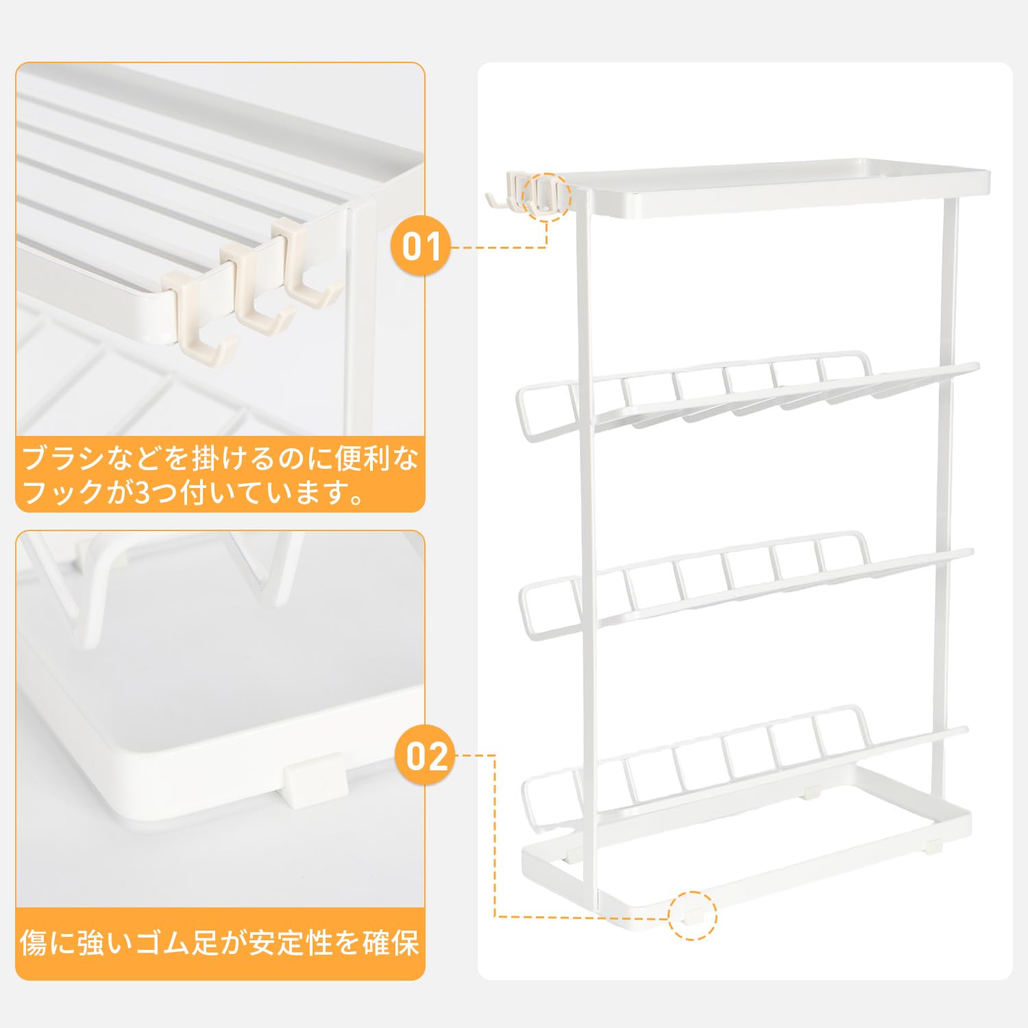 - 省スペース:小物が掛けられる便利なフック2つ付きます。下段と上段の間の高さが十分あるんのでシャンプーボトルや洗面用具が取り出しやすいです。 45度傾斜型デザインは、ボトルの保管と取り出しに便利です。