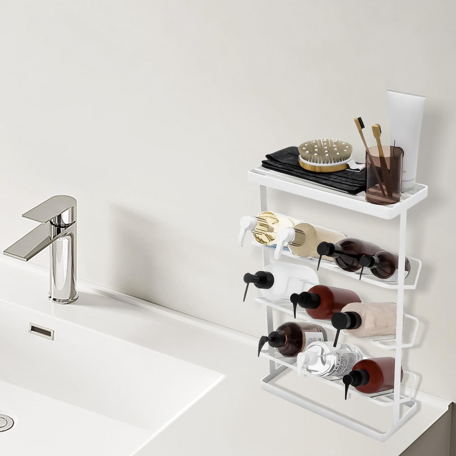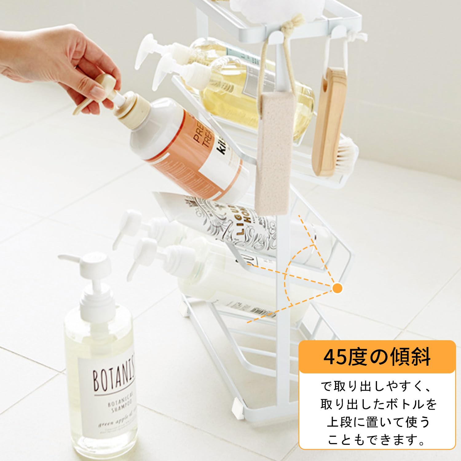 - 4段構造設計: 効率的な収納スペースを提供し、バスルームアイテムを整然と配置できます。シャンプー、コンディショナー、ボディケア用品など、多様なサイズのボトルを収納可能。