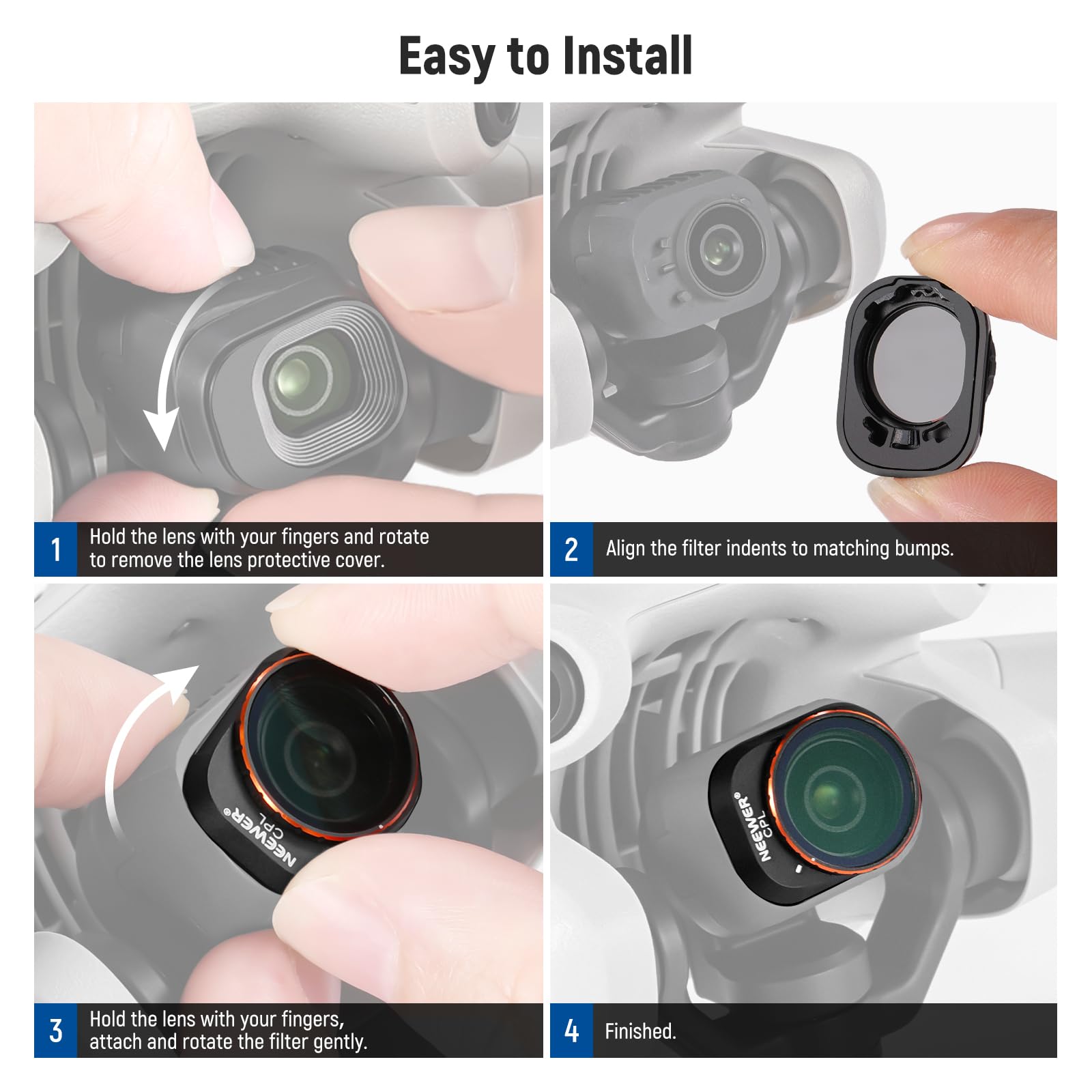 • 【コンパチブル Mini 4 Pro】ドローンフィルターセットは、コンパチブル Mini 4 Pro&Fly More Combo/Combo Plusで、円偏光フィルターと3種類ND(減光)フィルター(ND16、ND64、ND256)が含まれており、プロな空撮や動画撮影に最適です。取り付けは簡単で、元レンズを取り外し、フィルターをねじ込むだけです。