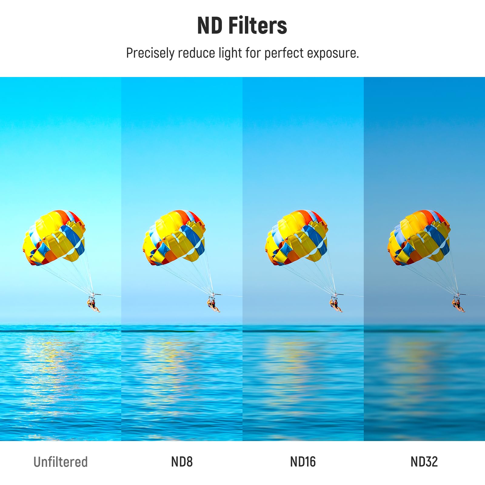 - 【柔軟な露出制御】ND8、ND16、ND32減光フィルターは、それぞれ3ストップ、4ストップ、5ストップの減光効果を提供します。様々な光量条件で正確な露出バランスを実現し、露出オーバーを防ぎ、ダイナミックなモーションブラー効果を生み出します。