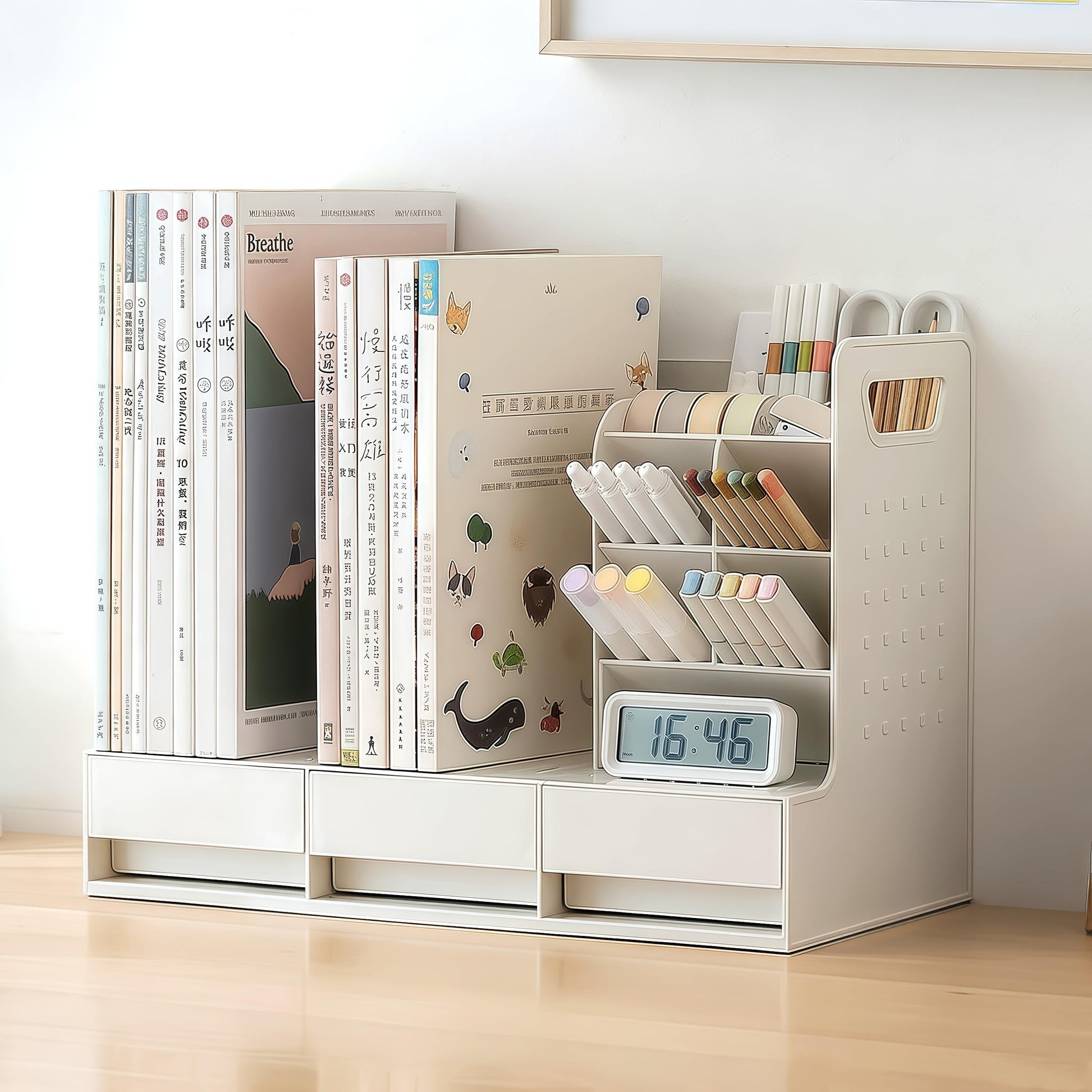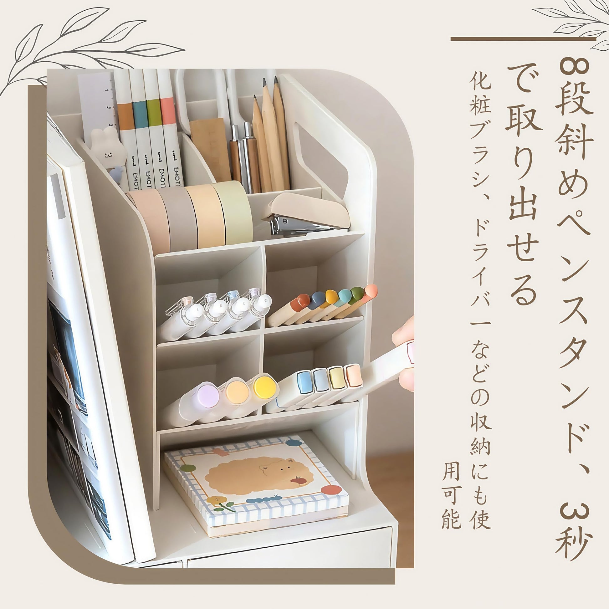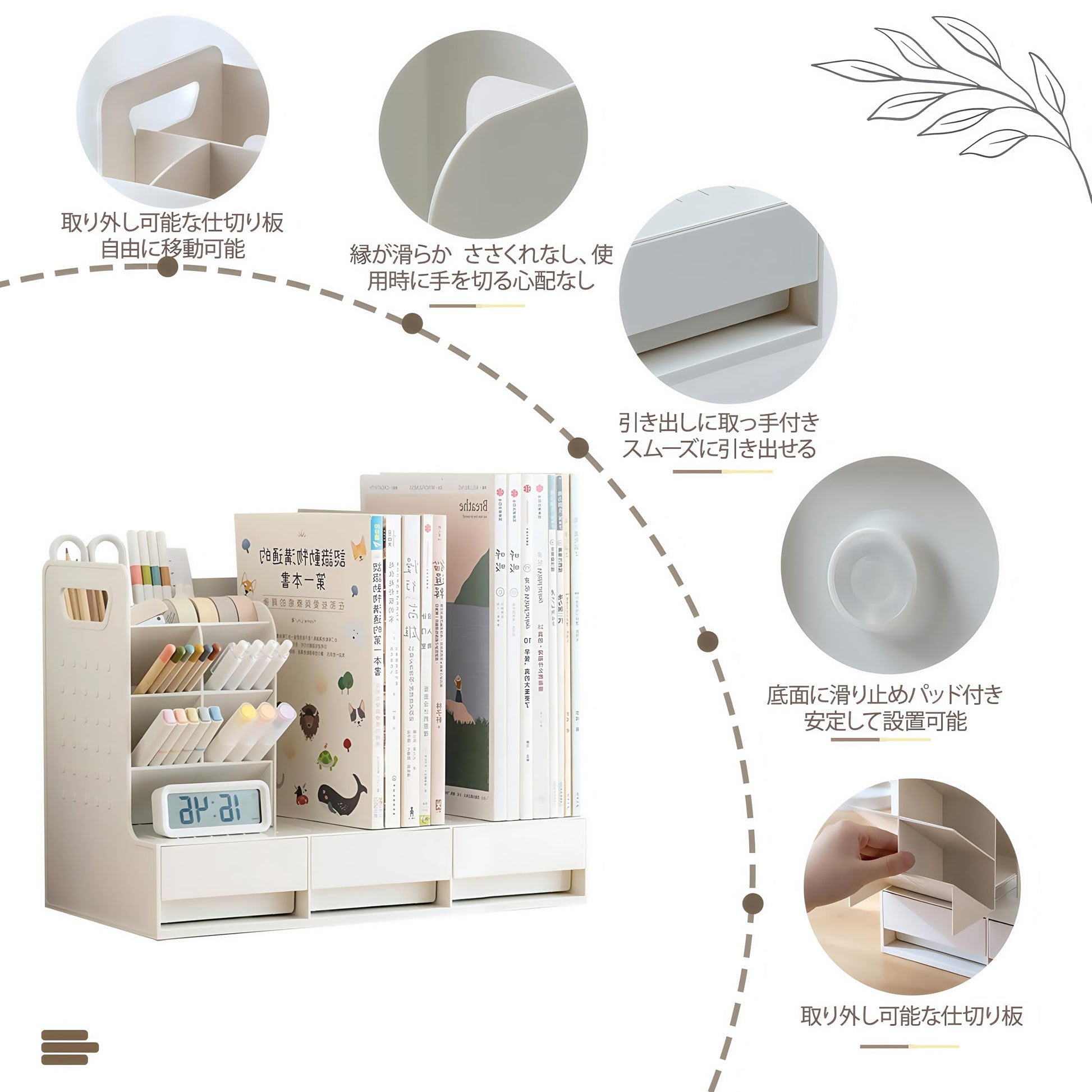 - 【超大容量!空間革命】デスクシェルフはコンパクト設計でありながら、驚きの大容量!本や雑貨がたっぷり収まる大型オープン収納スペースを3箇所、さらに小物収納に便利な小さな引き出しを3つ(底部) を備えています。縦型デザインで死角を解消、限られたスペースを最大限に活用し、すっきり快適な環境を実現します。