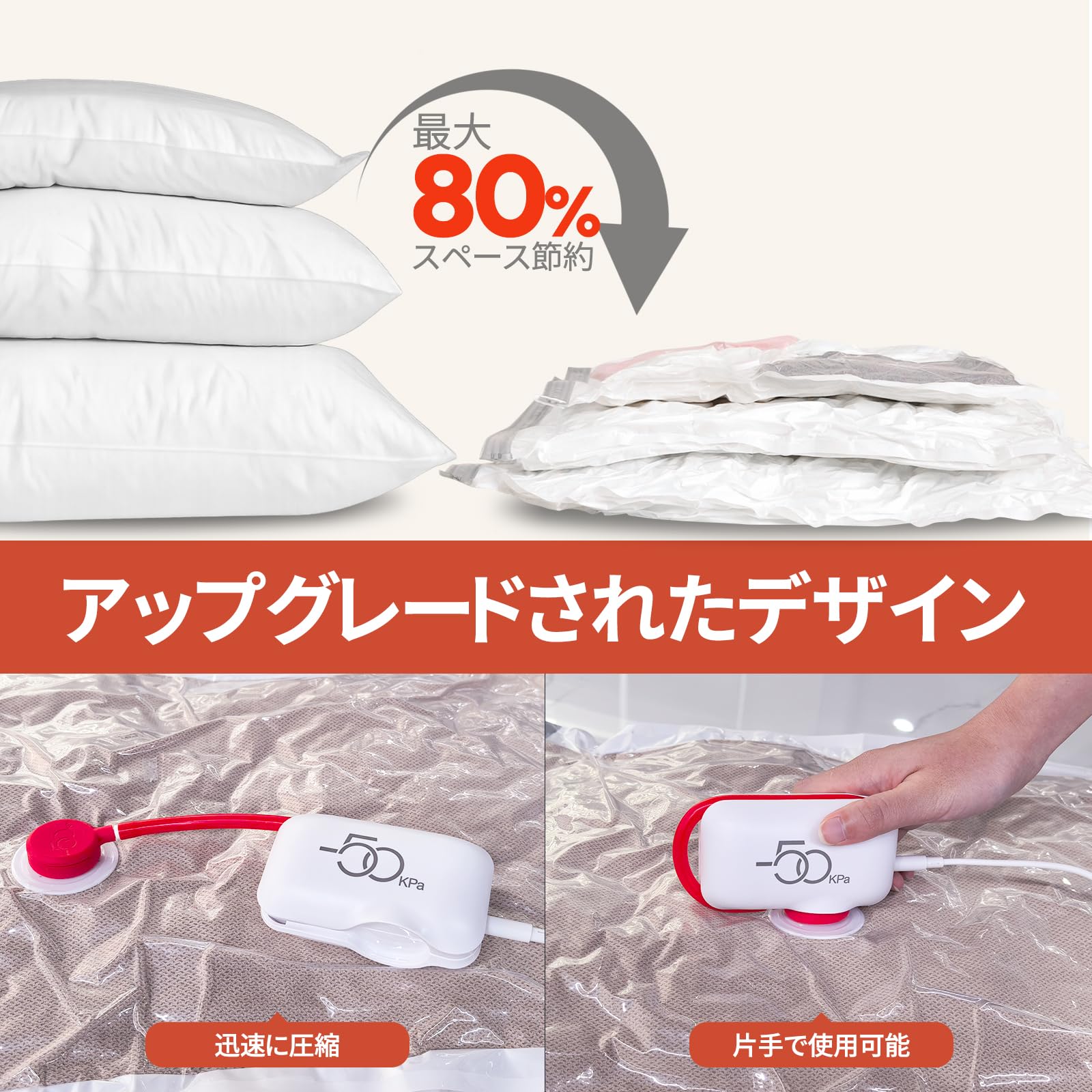 - 【USB電動ポンプ】この真空ポンプは最大吸引力50Kpaで、疲れることなく手のようにバッグを圧縮できます。そのため、2A以上のUSBを使用し、電源アダプター、ノートパソコン、モバイル電源などで簡単に給電できます。また、いつでもどこでも手軽に空気を抜くことができ、出張や旅行先でスーツケースに詰める際も、できるだけ小さくコンパクトにまとめることができます。