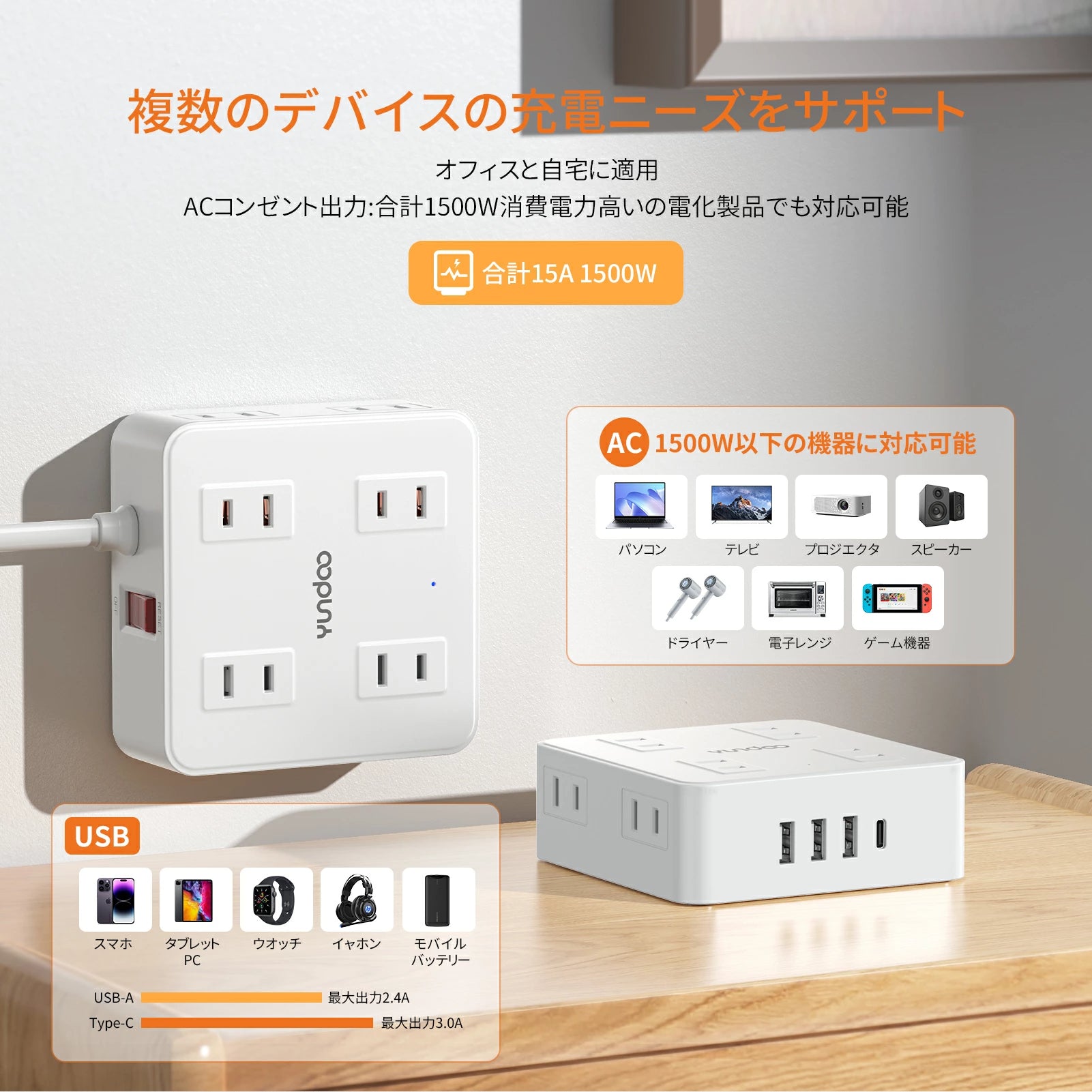 USB-A 3口とTYPE-C 1口のポート付き(各2.4A/5V、合計出力3.4A)で、スマートフォンとタブレットなどの充電により便利です。デジタル製品が識別でき、常に最適の電流を提供いたします。