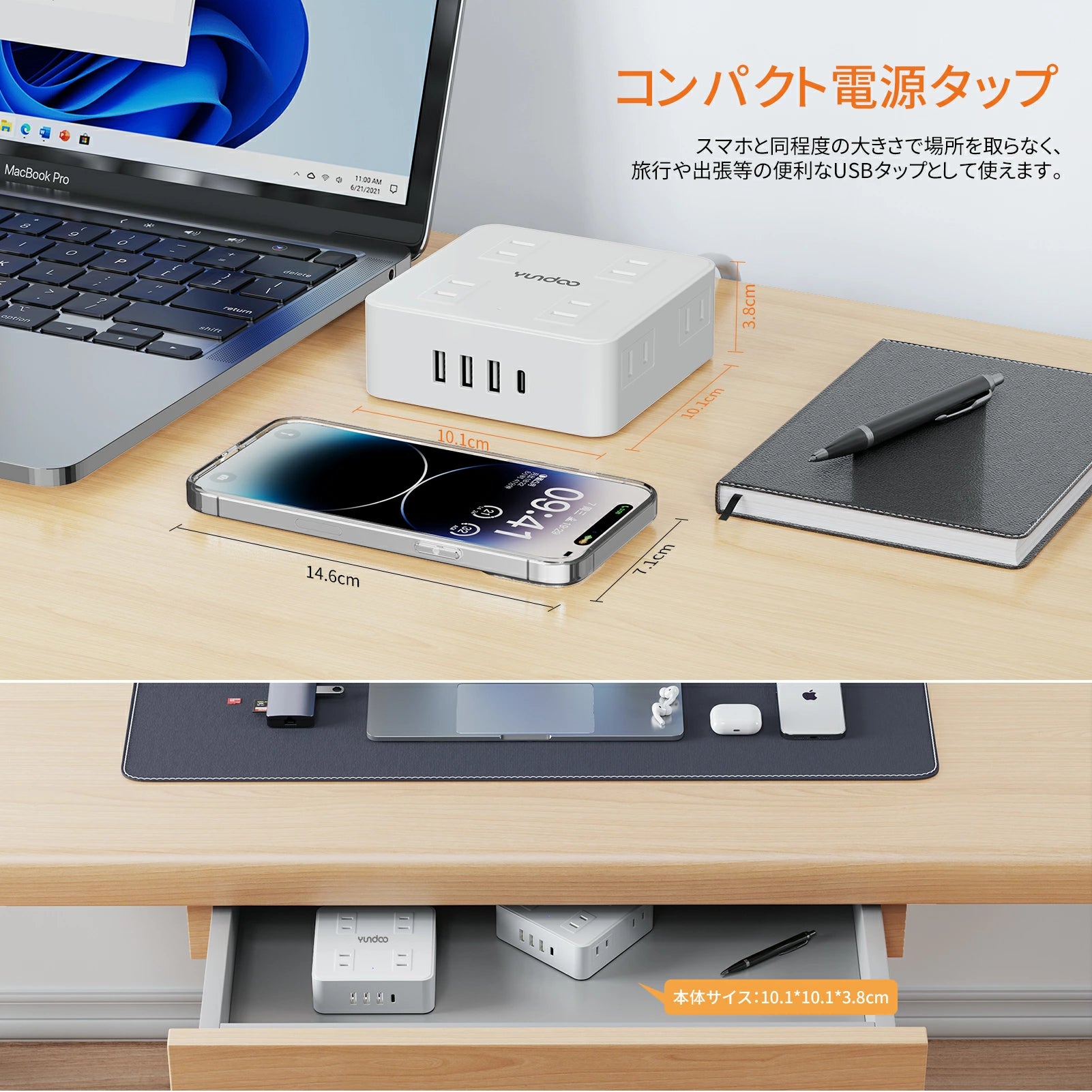 YUNDOO延長コード2mはフック穴付き横型のデザインで省スペースで、空間が有効に利用できます。そして、市販の一般的なコンセントより小型でコンパクトです(本体サイズ:僅か10.1*10.1*3.8cm)。2mの延長コードでどこにでも置けて、より便利な充電を提供します。 テレワーク、在宅勤務、室内、会社、家庭用、オフィス用、会議室用、パーティー用などには最適です。