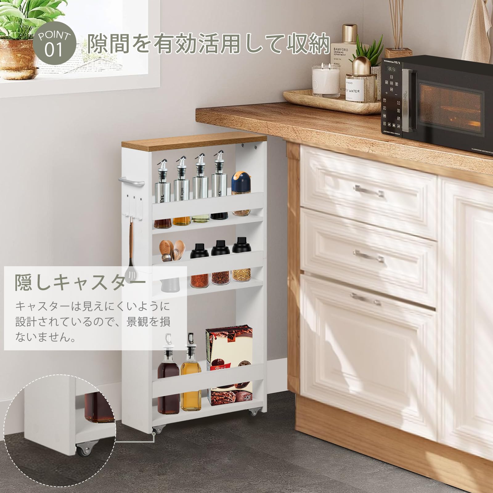 - 隙間収納に最適:幅40cm、奥行14cmのコンパクトなサイズなので、冷蔵庫やキャビネットの隙間など、狭いスペースにも設置でき、無駄なスペースを有効利用できます。