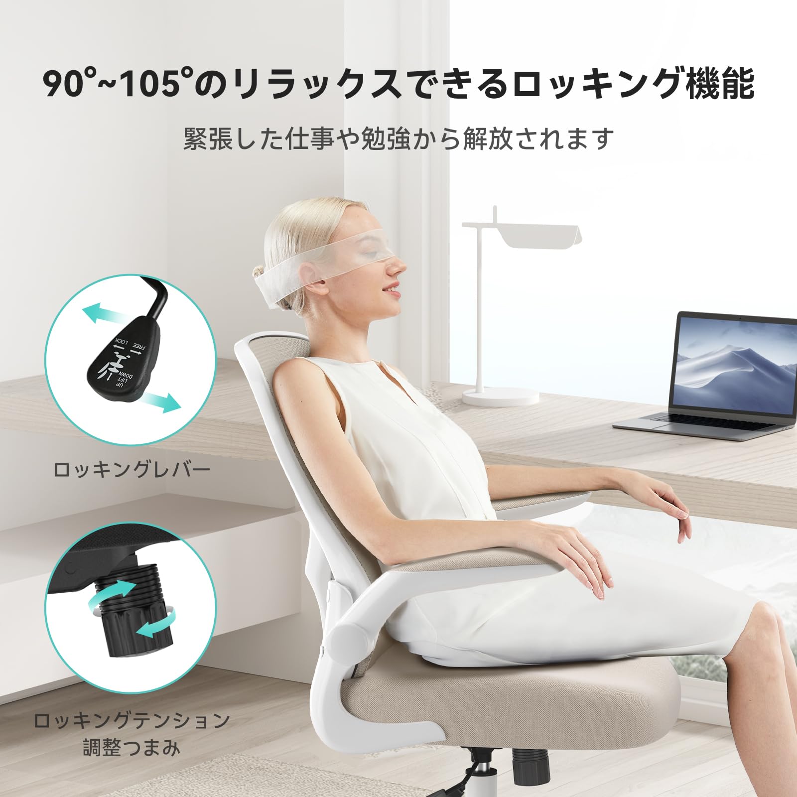 - 【多机能・調整可能】 柔軟に調整できる椅子です。自分のベストポジションに簡単に調整できます。特定のレバーで調節できる約15度ロッキング機能搭載、長時間の仕事や勉強の合間に、リラックスした時間をお過ごし、ちょっと疲れてしまったとの気分転換ができます。 そして、より効率的に仕事や勉強に再度入れます。お客様のニーズによって、椅子は座面昇降・360度回転・約25度ロッキング・跳ね上げ肘掛け・調節できるランバーサポートの機能が合計で構成されています。