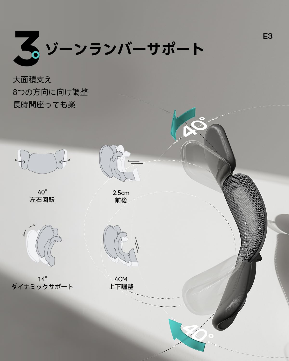 • 【3ゾーン分圧・腰サポート】3ゾーンランバーサポートとは、3つの区域に分けて腰を全方位に包んで支持し、それによって腰の保護作用を達成するという意味です。柔軟な材質で作られた両側サラウンド支持から左右側の腰脊椎と筋肉を保護し、中の部分は特製メッシュ素材で全体的を上に上げます。その他に8つ方向に調節でき、左右側にも内外40度調整と14度緩衝区を設置し、腰背圧を極大に緩和することができます。