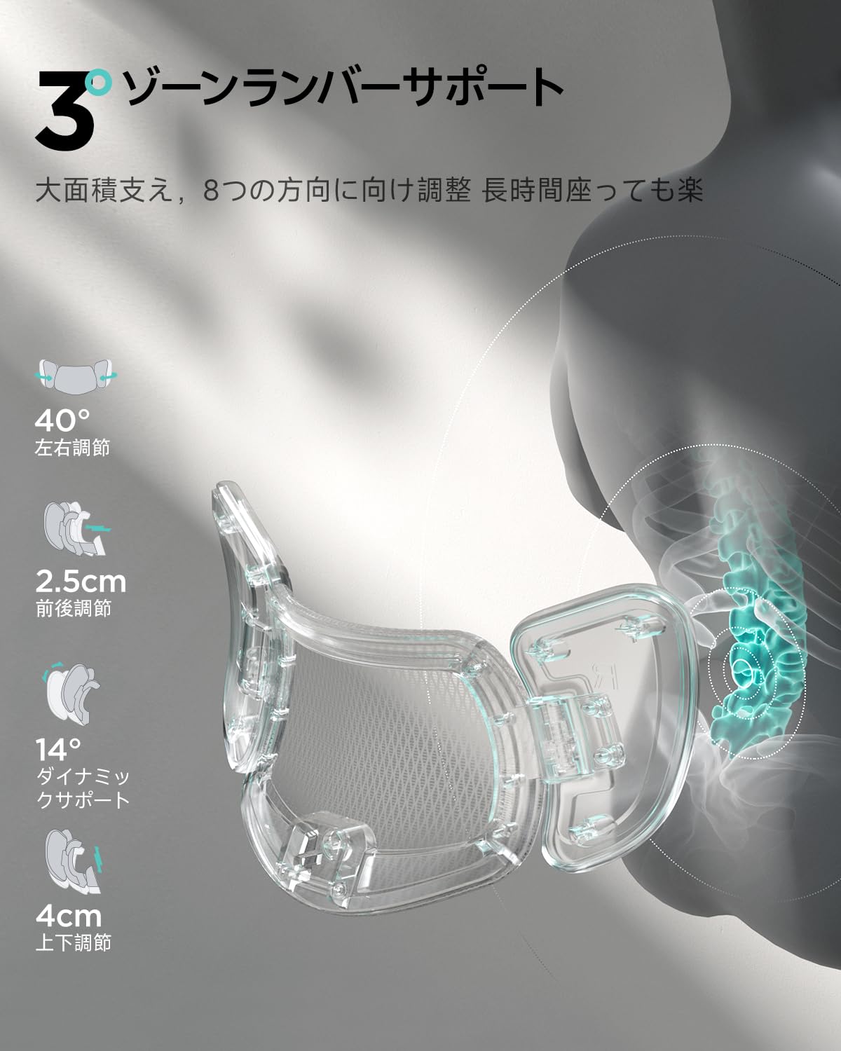 - 【3ゾーン分圧・腰サポート】3ゾーンランバーサポートとは、3つの区域に分けて腰を全方位に包んで支持し、それによって腰の保護作用を達成するという意味です。柔軟な材質で作られた両側サラウンド支持から左右側の腰脊椎と筋肉を保護し、中の部分は特製メッシュ素材で全体的を上に上げます。その他に8つ方向に調節でき、左右側にも内外40度調整と14度緩衝区を設置し、腰背圧を極大に緩和することができます。