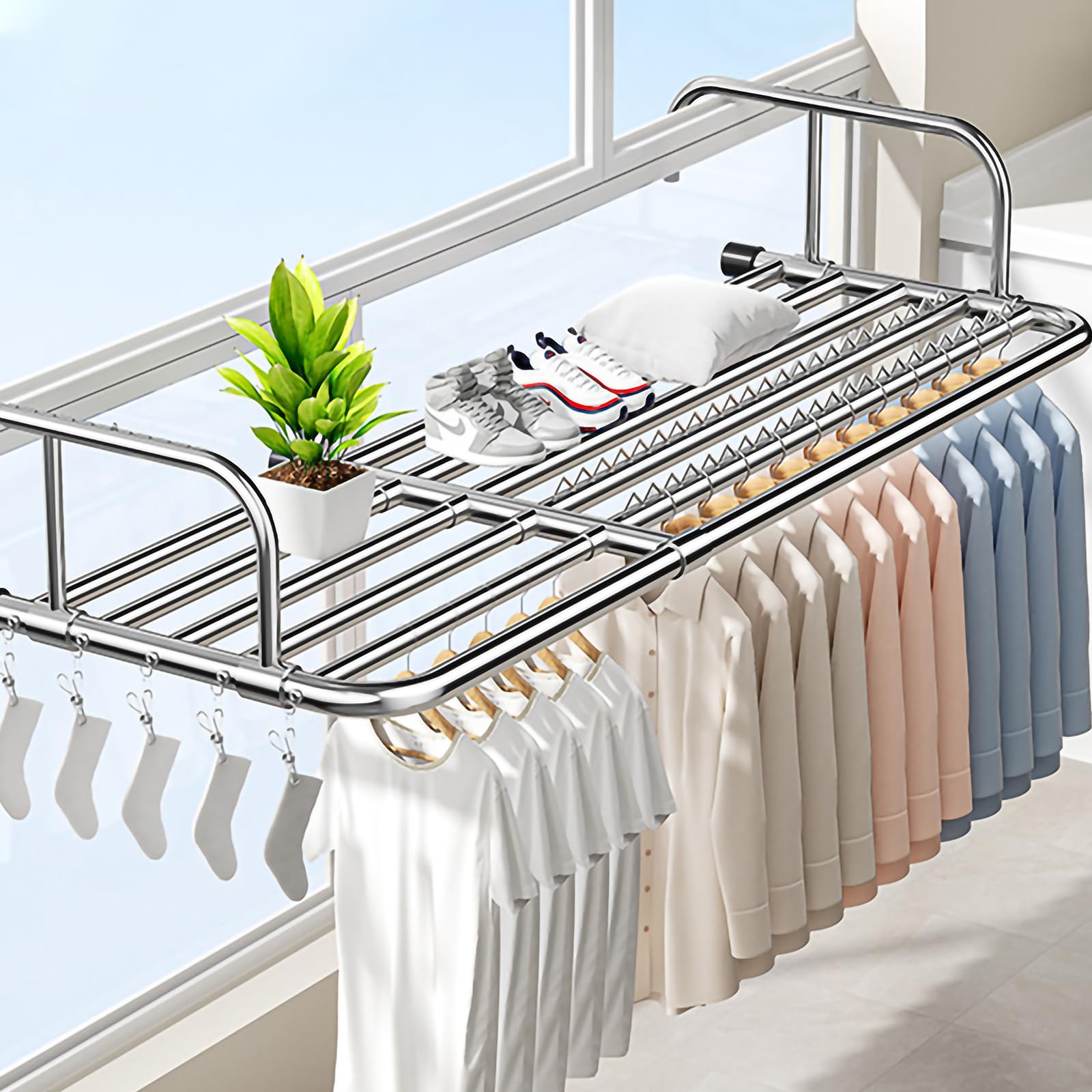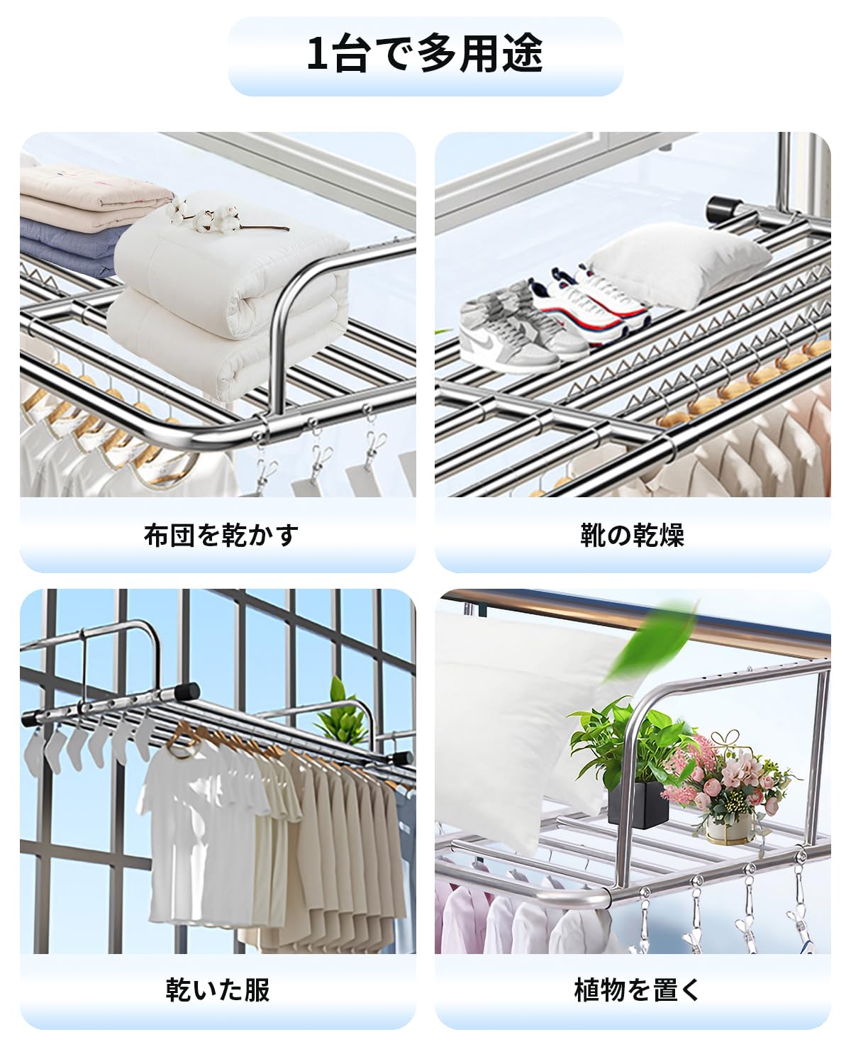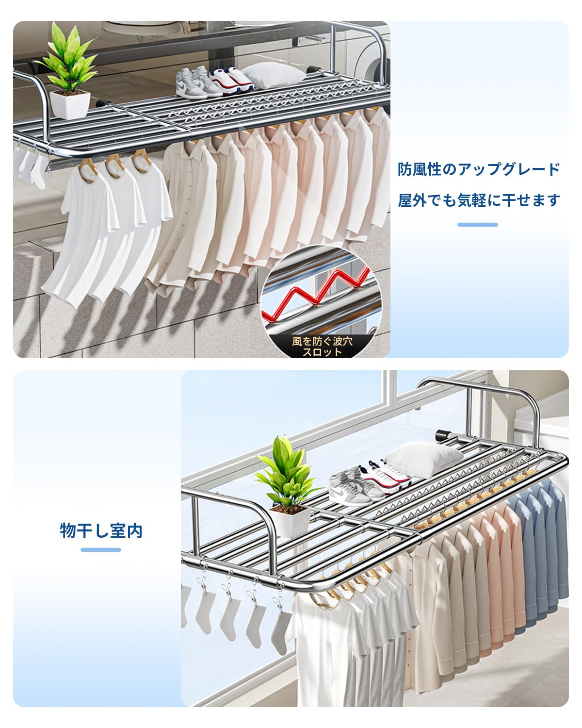 • 【高品質ステンレス材質】物干しハンガーはステンレス材質を採用し、耐傷性、耐高温性、優れた製品、耐久性、防水性、防錆性、変形のない安定構造、強大な積載能力を有する