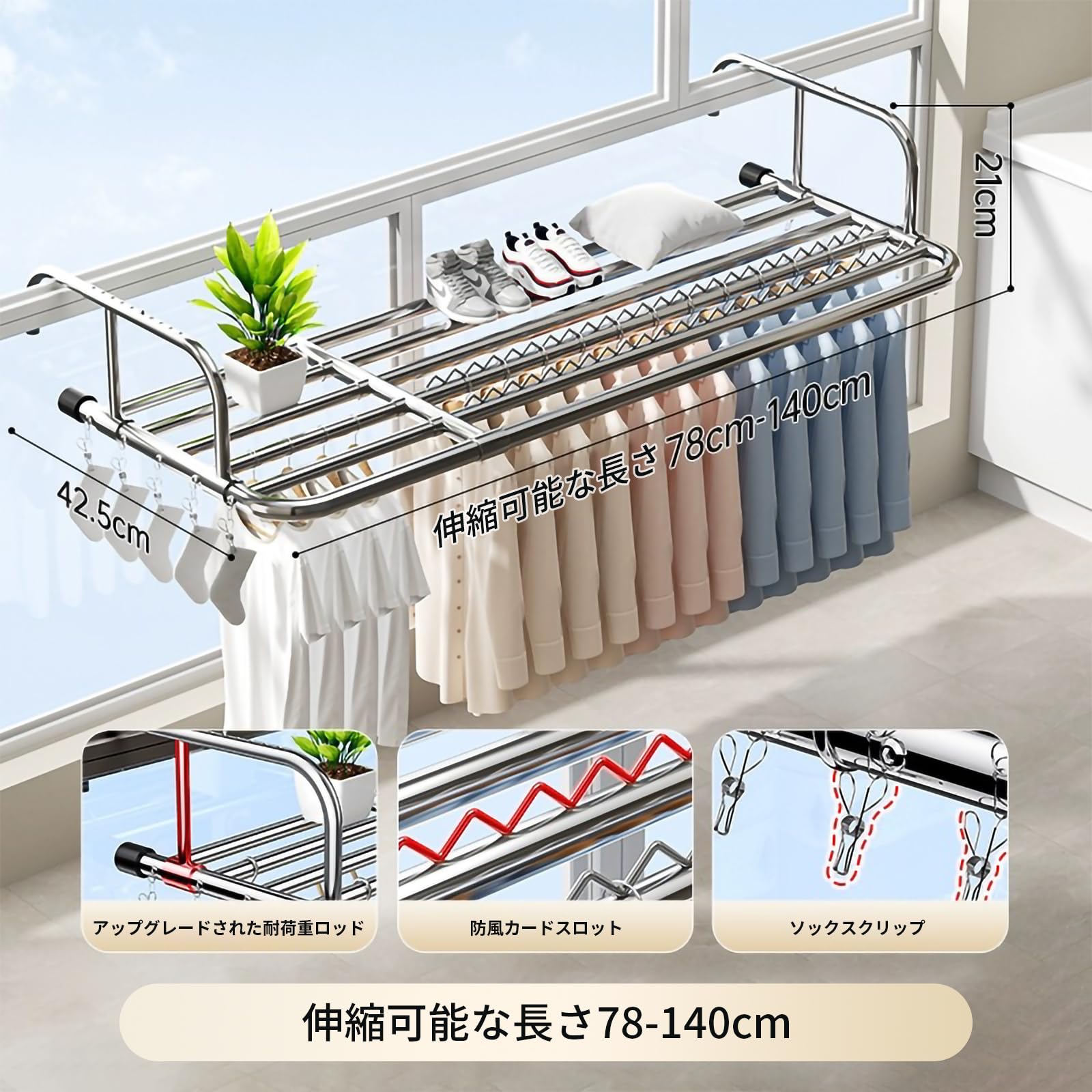SmartMaster 物干し ベランダ物干し ピンチハンガー 10個ピンチ付き 伸縮可能 78-140cm 洗濯 室内 屋外 防風フック 耐荷重25kg 組み立て不要 折りたたみ式 収納便利 タオルハンガー 省スペース 花台 ラクラク干せる(78-140cm)